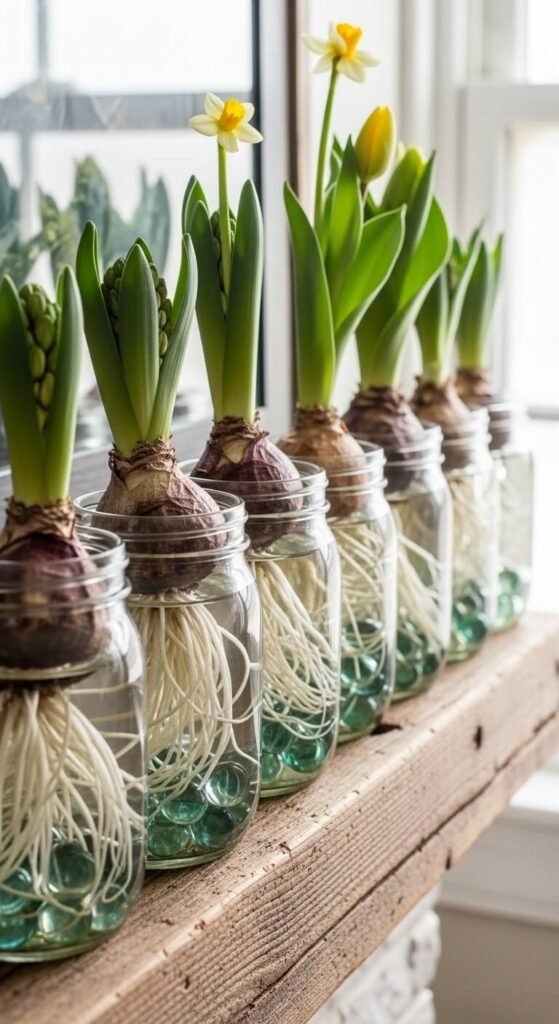 This living decor costs $2 per jar. Kids love watching the growth process. After blooming, plant bulbs outside for next year. Line up 4-5 jars for a cohesive display.