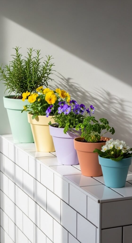 This costs under $10 for paint and pots. The custom colors tie everything together. Water plants weekly and harvest herbs for meals. Functional and beautiful—the best kind of decor.