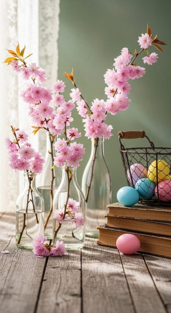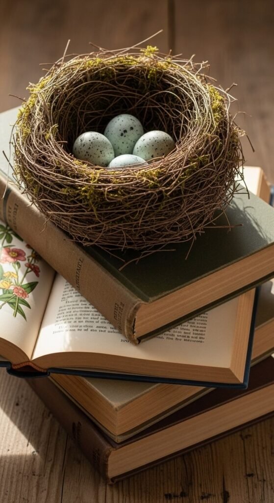 Stack three old hardcovers on your coffee table. Top them with a faux bird’s nest from the craft store or one you found outside last year. Add speckled eggs (plastic ones work fine). This arrangement tells the story of new beginnings. Choose book spines with nature-themed titles for extra impact. The whole setup takes five minutes and costs maybe $8 if you buy the nest.