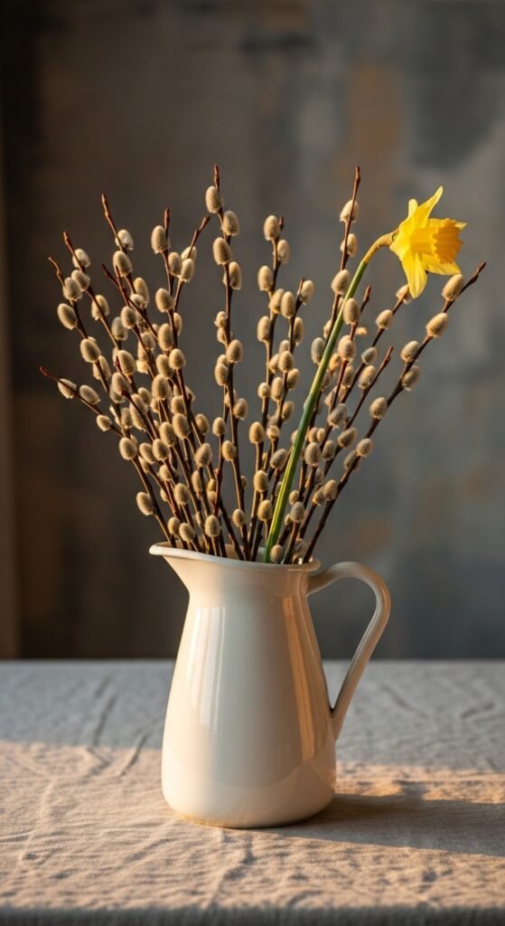 Cut pussy willow branches from your yard or buy a bundle for $5. Stand them in a vintage pitcher—no water needed since they’re dormant. The fuzzy catkins add texture and tell a story of early spring when nothing else blooms yet. Add one bright tulip for color pop. This arrangement lasts weeks without maintenance. The height creates drama without taking up surface space.
