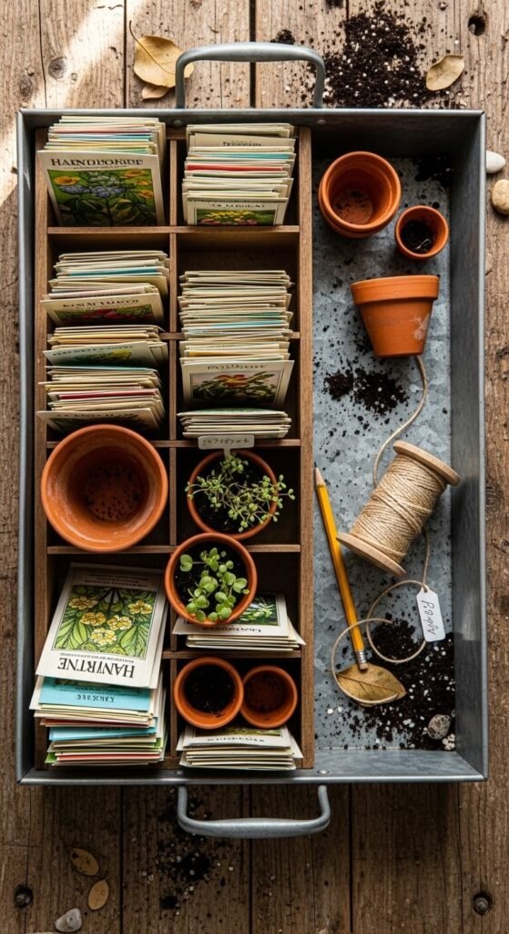 Use a large tray to corral all your seed-starting supplies. Arrange packets, small pots, soil, and labels so everything’s ready to grab. This organized prep station tells the story of someone who gardens with purpose. The metal tray contains the mess. You can move the whole setup from table to porch easily. Trays cost around $12, and organization makes you more likely to actually plant.
