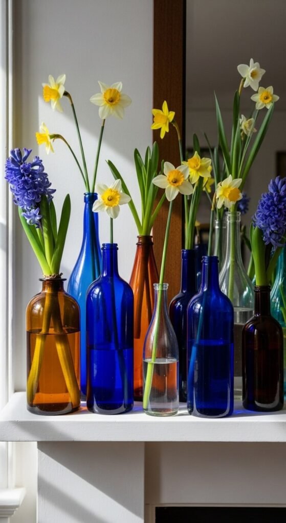 Collect old bottles from thrift stores—different shapes, colors, heights. Place one flower stem in each. Group them on a mantel or shelf. The individual bottles tell separate stories but work together. Single stems make grocery store flowers stretch further. Each bottle costs $1-3 at thrift shops. Change flowers weekly, but keep the bottle collection permanent for year-round versatility.