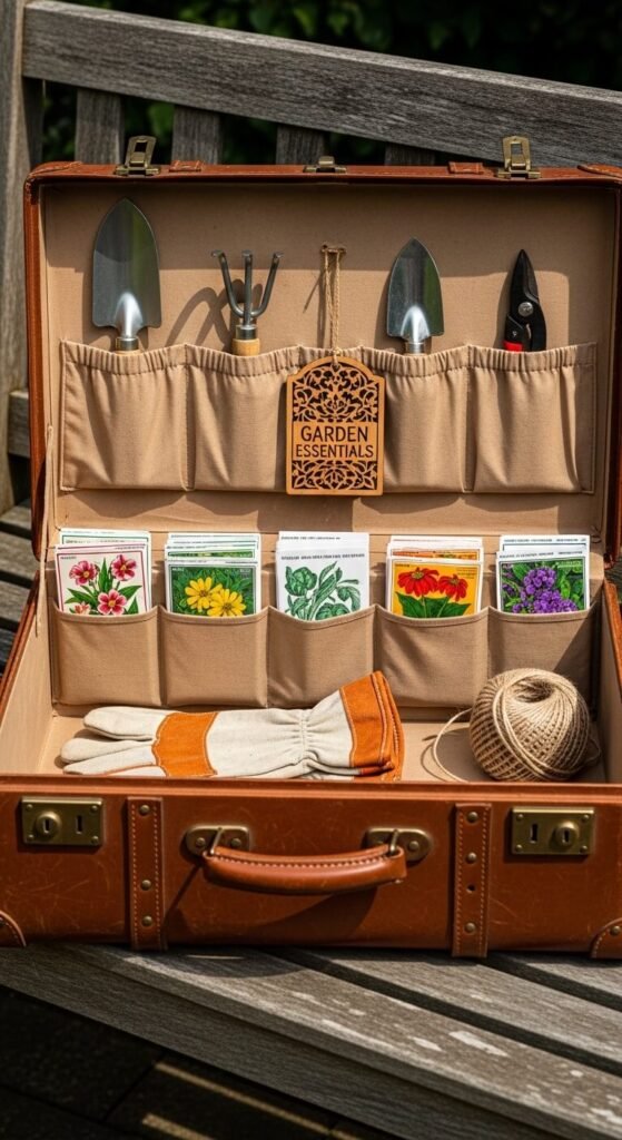 An old suitcase from your attic stores seed packets, gloves, and small tools. Keep it open on a bench or closed under a table. The vintage travel piece tells a story of journeys and seasons. Line it with fabric scraps for polish. Suitcases run $10-20 at estate sales. This mobile garden station follows you around the yard or looks pretty displayed indoors.