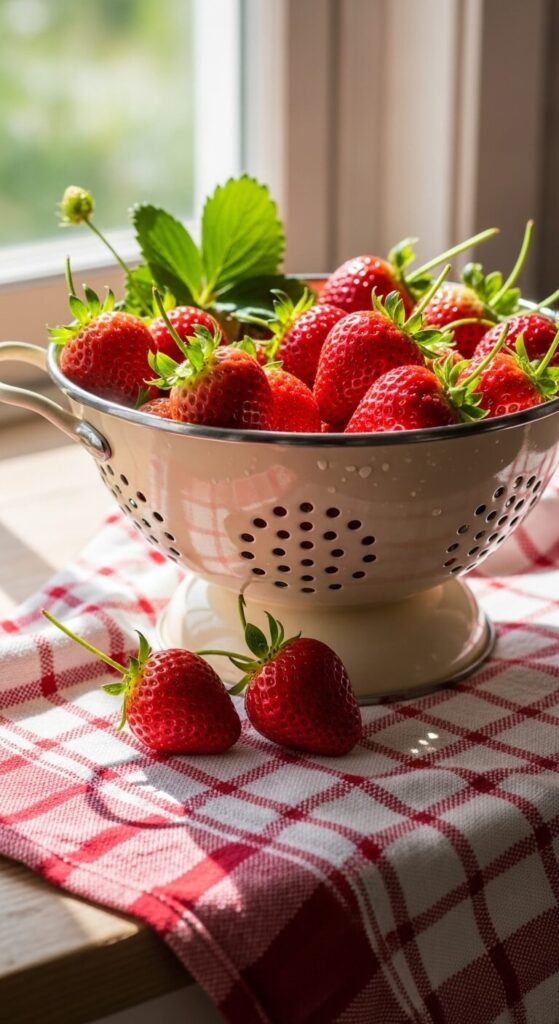 Fill an old metal colander with strawberries—real ones from the market, not fake fruit. The holes let light through and create shadows. This kitchen vignette tells a story of homegrown abundance even if you bought them. The colander drains berries naturally. After photographing, rinse and eat them. Colanders cost $3 at thrift stores. Seasonal fruit makes the display relevant and temporary.