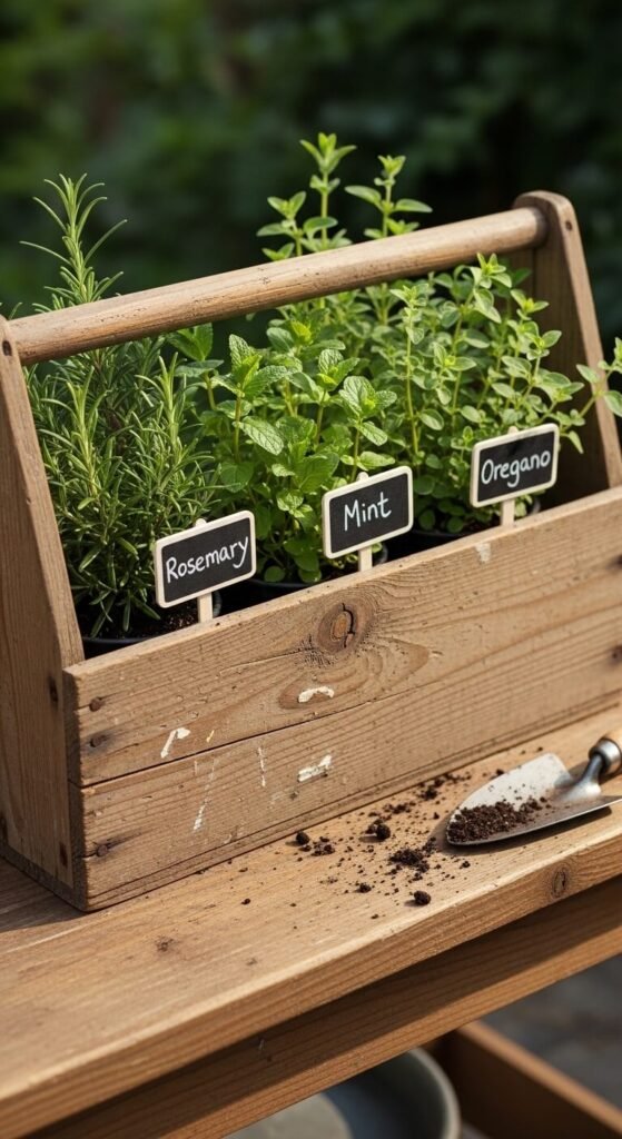 Line an old wooden toolbox with plastic and fill compartments with herb plants. Label each section with chalkboard markers. The toolbox becomes a portable kitchen garden with a story. You can move it from porch to kitchen as needed. Sand rough edges for safety. Toolboxes cost $5-15 at flea markets. Herbs run about $3 each and provide cooking ingredients all season.