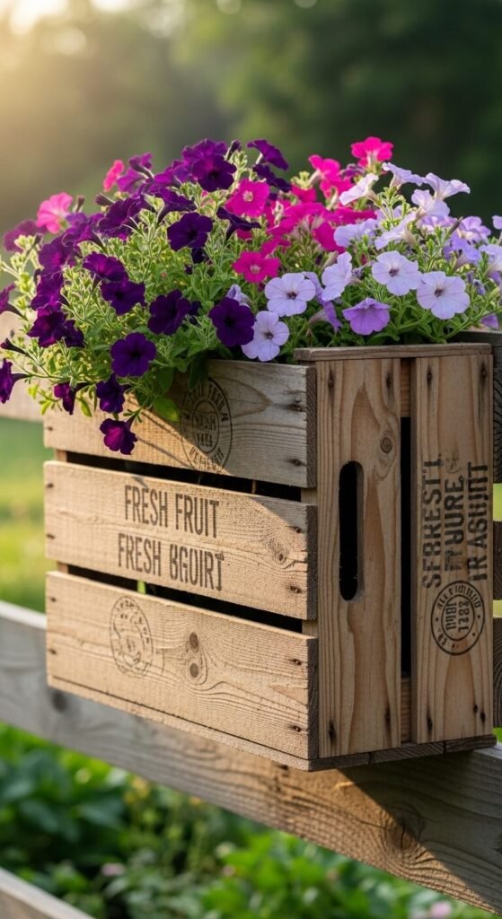 Mount an old wooden crate to your fence or wall. Line with landscape fabric and fill with trailing flowers. The vertical arrangement saves ground space and tells an upcycling story. Fruit crates have authentic aged patina. Drill drainage holes in the bottom. Secure it firmly to support soil weight. Crates run $5-10 at antique shops. Flowers cascade naturally over the worn wood edges.