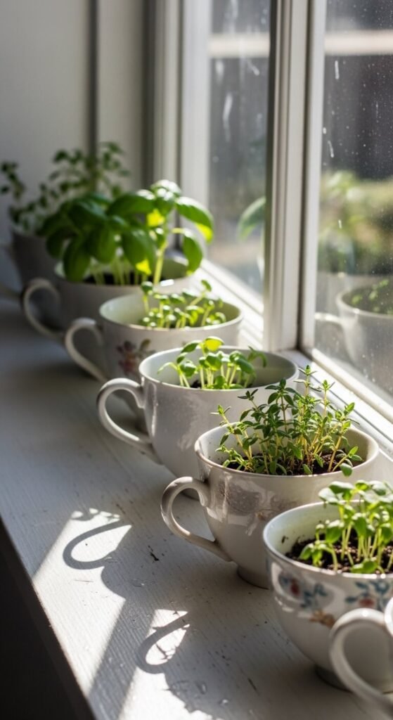 Grab those thrift store teacups collecting dust in your cabinet. Fill them with potting soil and plant herb seeds like basil, thyme, or parsley. Line them along your kitchen window where they’ll catch morning sun. The mix of floral patterns and greenery creates a charming story of vintage meets living garden. Water sparingly and watch your culinary vignette grow. This costs under $10 and gives you cooking herbs by summer.
