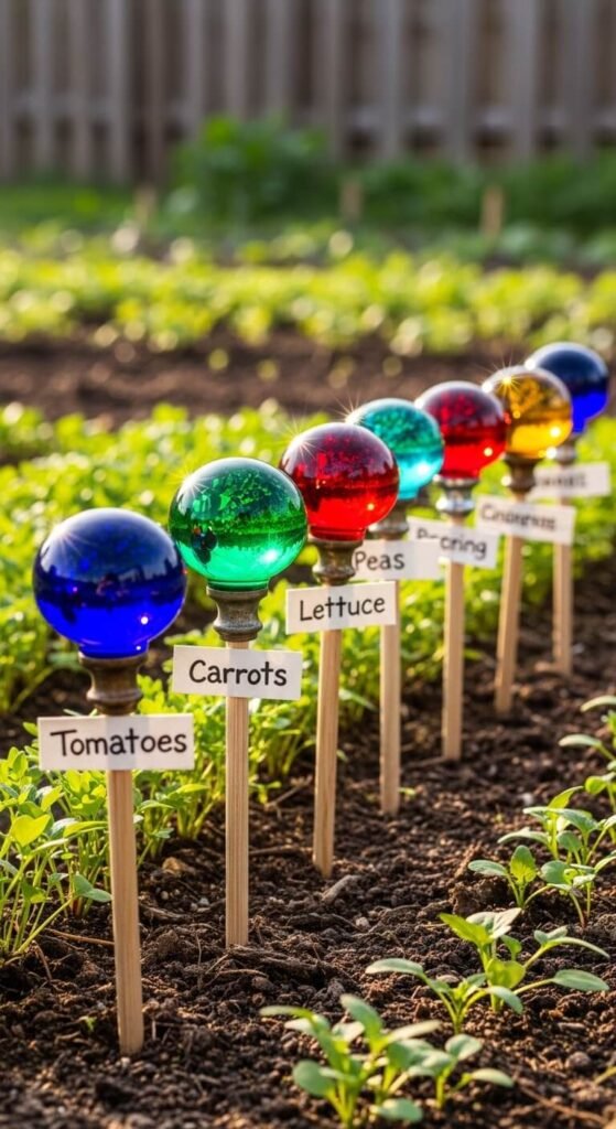 Attach old doorknobs to wooden dowels with strong glue. Push them into garden beds as plant markers. The glass catches light and tells a story of homes past. Label varieties on the wood if needed. Doorknobs cost $1-2 at architectural salvage stores. Cut dowels to matching heights. This garden art marks your rows while adding sparkle. The whole project takes an afternoon.