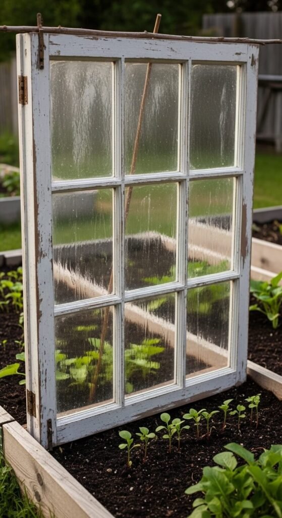 Prop an old window frame over seedlings in your garden bed. The glass protects tender plants while telling a story of resourcefulness. Weight corners with stones so wind doesn’t blow it away. The vintage glass diffuses light beautifully. Windows cost $5-20 depending on size. This portable greenhouse extends your growing season. Remove it once plants mature enough to handle weather.