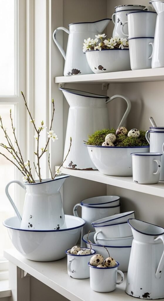 Group vintage enamelware pieces on a shelf. Fill some with flowers, others with moss or eggs. The matching finish creates cohesive storytelling even with mismatched shapes. White enamel reflects light and feels clean. Hunt for pieces at estate sales—usually $3-8 each. The collection grows over time. Rotate what you fill them with as seasons change, but the base display stays constant.