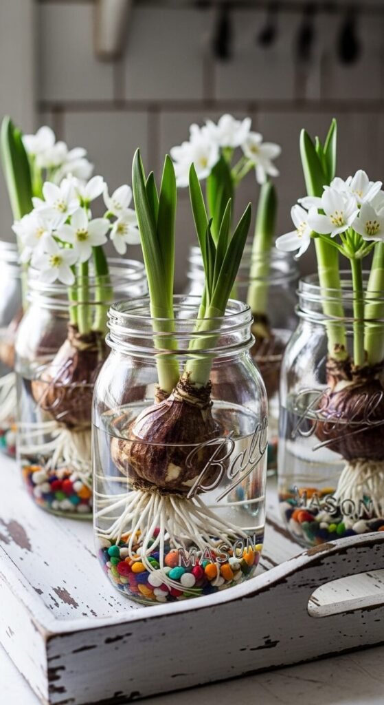Fill mason jars halfway with water and pebbles. Balance paperwhite bulbs on top so roots touch water. Watch them grow over two weeks. Group three or five jars on a tray for visual impact. The visible roots tell a growth story that kids love tracking. Paperwhites cost about $1 each at garden centers. Change water weekly to keep it clear and fresh-smelling.