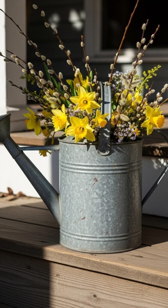 That old watering can in your garage makes a perfect vase. Fill it with grocery store tulips or branches you clipped from your yard. The contrast between utilitarian metal and delicate flowers creates a farmhouse story. No floral foam required—just add water. Foraged branches are free, and a $5 bouquet looks expensive in the right container. Place it by your front door.