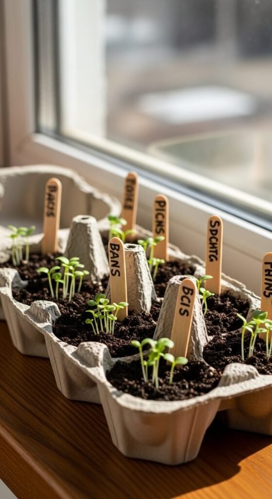 Save your egg cartons and fill each cup with soil. Plant different flower or vegetable seeds in each section. Label them with popsicle sticks and marker. Display the whole carton on a sunny shelf. This vignette shows resourcefulness and anticipation. Kids can help plant and track growth. The entire project costs whatever seeds run—often $2 per packet—and uses materials you’d throw away.