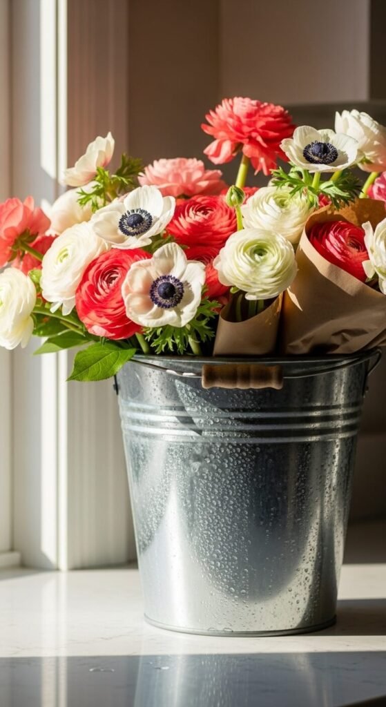 Buy flowers at the farmer’s market and keep them in their paper wrapping. Drop the whole bundle in a galvanized bucket. This casual “just picked” look tells a story of Saturday morning market trips. Don’t fuss with arrangement—the messy abundance is the point. A bucket costs $8 at hardware stores, and market flowers run $6-10. The look beats formal arrangements any day.