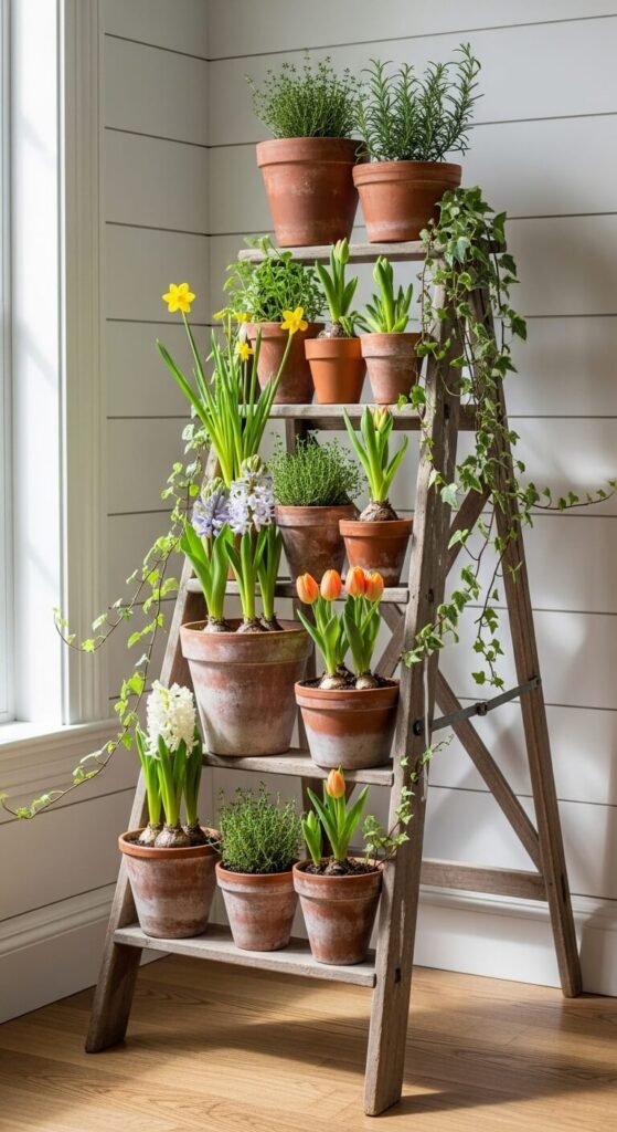 That old stepladder in your basement becomes instant garden shelving. Set potted plants on different rungs—geraniums up top, trailing ivy below. The vertical story draws eyes upward and saves floor space. Sand the ladder if it’s rough, or leave it shabby. Each rung holds a different plant personality. Use pots you already have. Position it in a bright corner where plants will actually thrive.