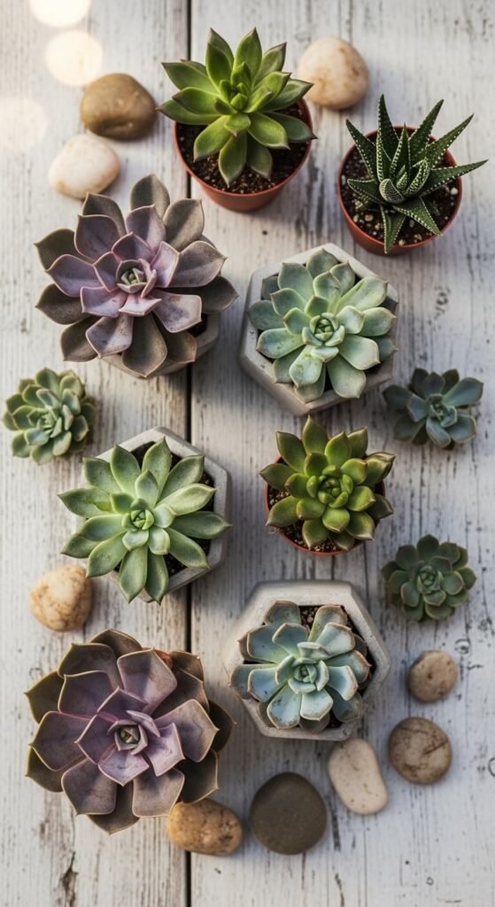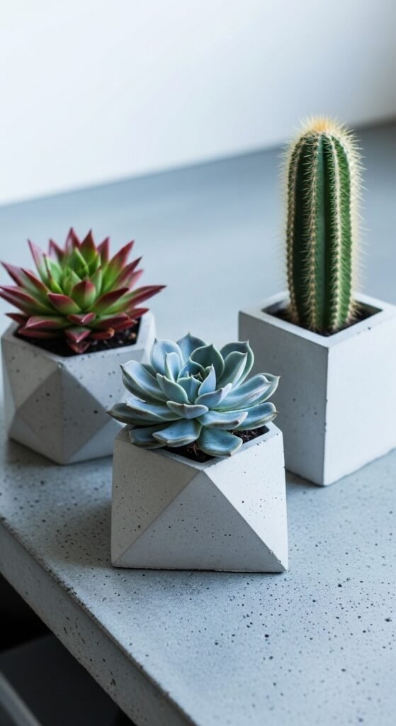 Geometric concrete planters are everywhere right now — and for good reason. Their sharp angles contrast beautifully with soft, rounded succulent leaves. You can make your own using molds and quick-set concrete for under $15. YouTube tutorials make it surprisingly simple. Pick angular hexagons or triangles for a modern look. Use one large statement succulent per planter to keep the visual clean. These look sharp on desks, shelves, or entryway tables.