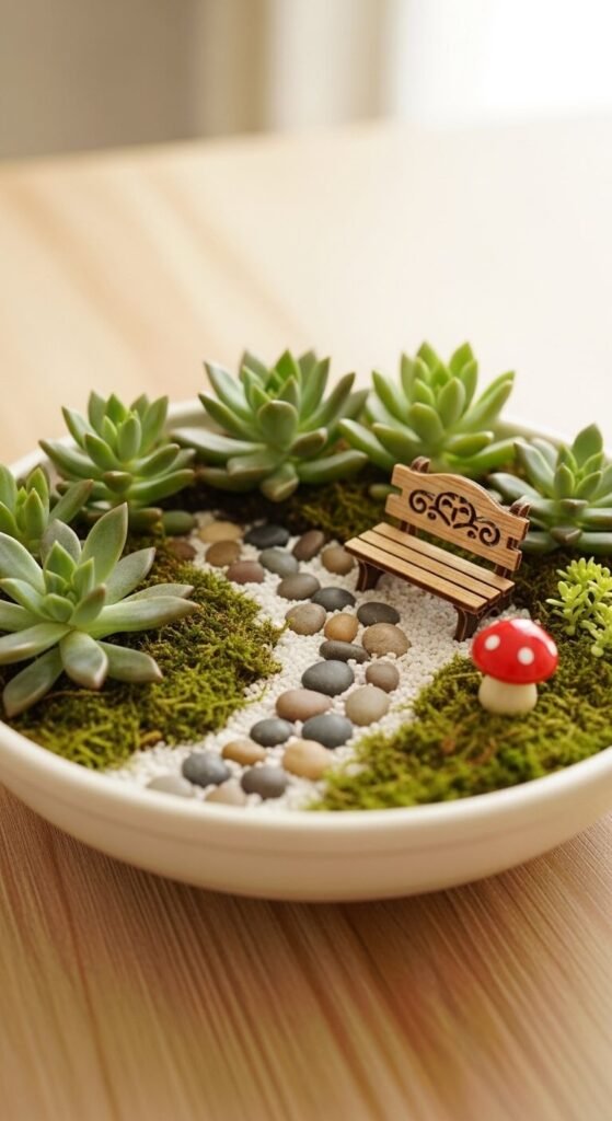 Fairy gardens are playful, personal, and surprisingly easy to make. Use a wide, shallow ceramic or terracotta dish as your landscape. Fill it with cactus mix and create a tiny scene with mini figurines, pebbles, and small driftwood pieces. Use dwarf or slow-growing succulents to keep scale realistic. Add colored sand or moss for ground cover. Kids absolutely love these. You can find mini garden accessories at dollar stores or craft shops for under $5 each.