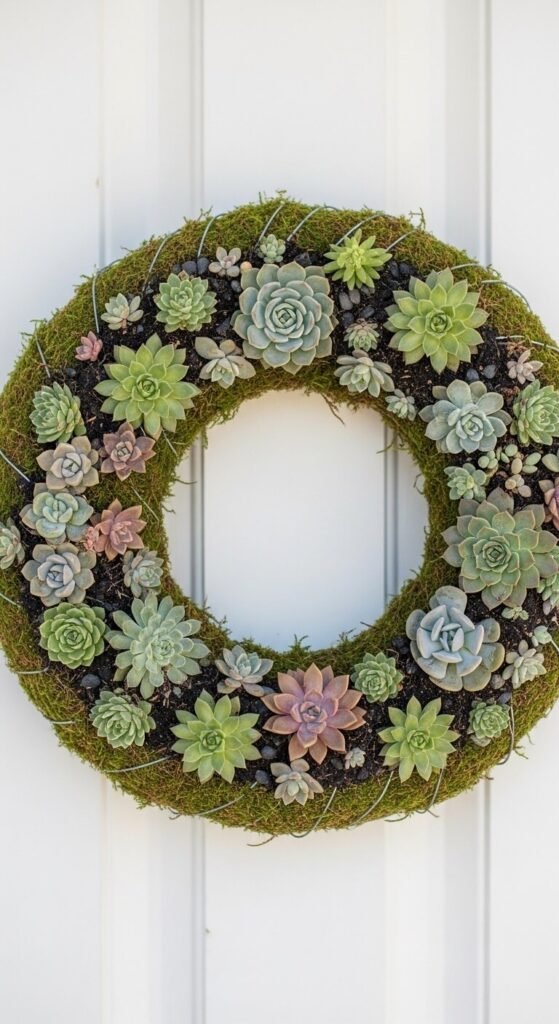 A succulent wreath makes a striking first impression at the front door. Start with a wire wreath frame stuffed with sphagnum moss. Push succulent cuttings directly into the dampened moss. They’ll root within a few weeks. Keep it horizontal for the first two weeks while roots establish. Then hang it vertically. Mist the back of the wreath every 1–2 weeks to maintain moisture. Succulents are durable enough to handle outdoor conditions in most climates. This wreath can last a year or more.