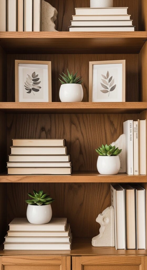 Books and succulents are a natural pairing. Place small succulents at the end of book rows or between stacks for a styled, intentional look. White or ceramic pots look clean against wood shelves. Choose succulents that tolerate lower light levels, like Haworthia or Gasteria. Rotate them to a bright window every week or two. This is a zero-cost styling change if you already have succulents and a bookshelf. It adds life and color to an otherwise flat surface.