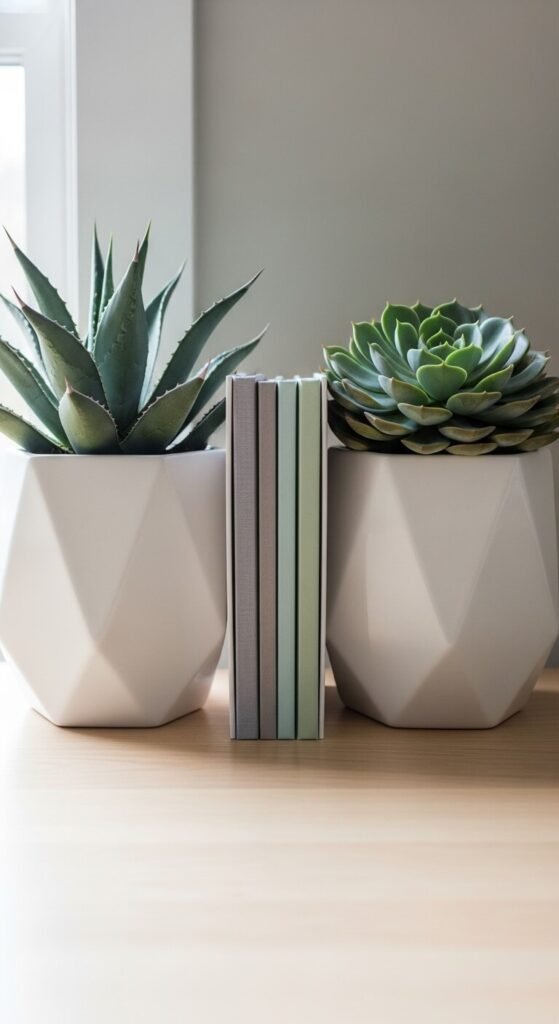 Use two matching planters as bookends on a desk or shelf. This is a functional decor hack that costs almost nothing extra if you already have pots and books. Choose succulents that grow upright and have some height — agave types or tall echeverias work well. Make sure pots have drainage before placing them near books. Use waterproof saucers underneath. This adds greenery to a workspace without taking up extra room.