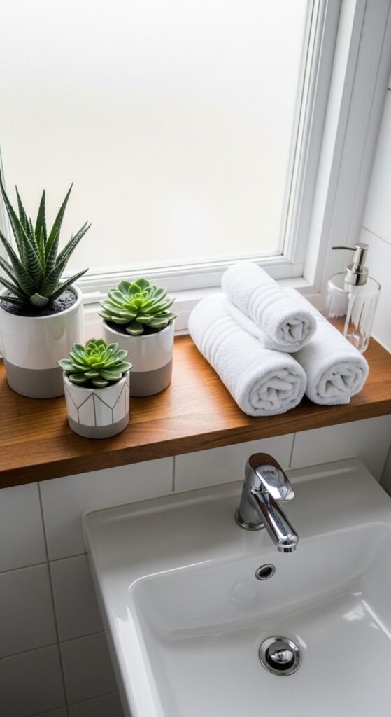 Bathrooms often get ignored when it comes to plant styling. But succulents that tolerate humidity, like aloe and Haworthia, do surprisingly well in bathrooms with natural light. Place them on a small shelf above the sink or on the back of the toilet tank. Use simple white ceramic pots for a clean, spa-like feel. If the bathroom has no window, rotate the succulent to a brighter room weekly. This small addition makes a bathroom feel less clinical and more personal.