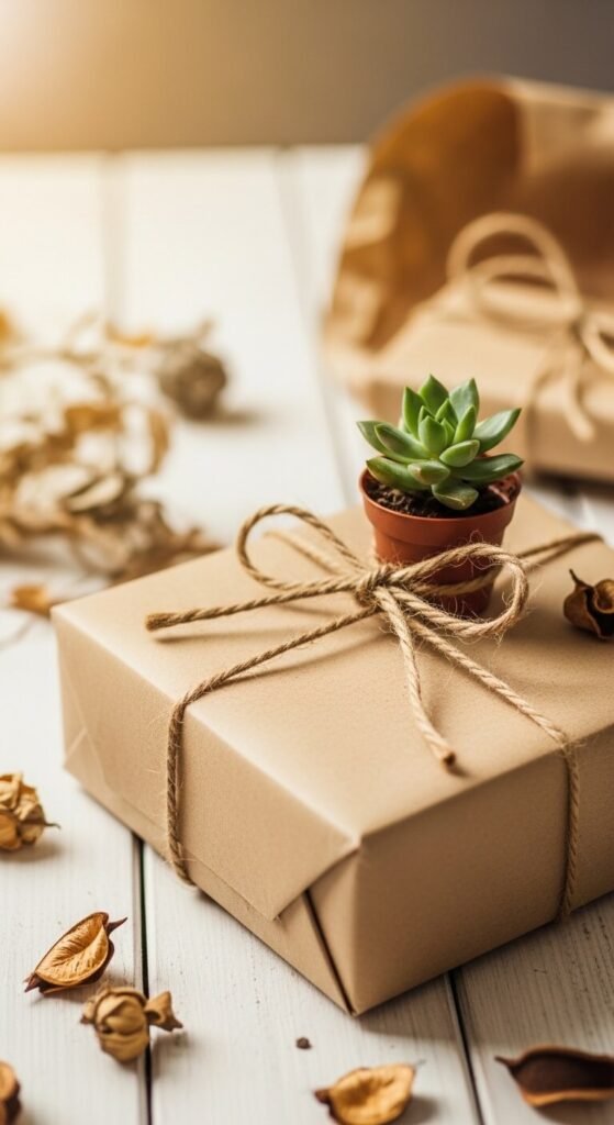 Turn a gift into something memorable by adding a small succulent as the topper. Tuck a tiny pot or a succulent cutting under the ribbon instead of a bow. The recipient keeps the plant long after the wrapping is gone. It adds a personal, handmade feel without much extra cost. Buy small succulents in bulk from garden centers — you can often get six small cuttings for under $5. This works beautifully for birthdays, housewarmings, or thank-you gifts.