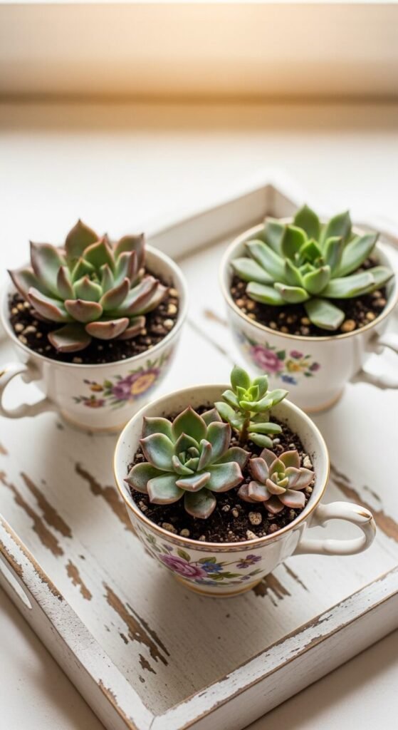 Old teacups make some of the most charming succulent planters. Check thrift stores for mismatched vintage cups — they usually cost under $1 each. Add a thin layer of pebbles at the bottom for drainage since cups have no holes. Fill with cactus mix and plant a small rosette succulent. Arrange three or four on a wooden tray for a curated display. This works perfectly for kitchen counters, windowsills, and dining sideboards. Very low cost, very high charm.
