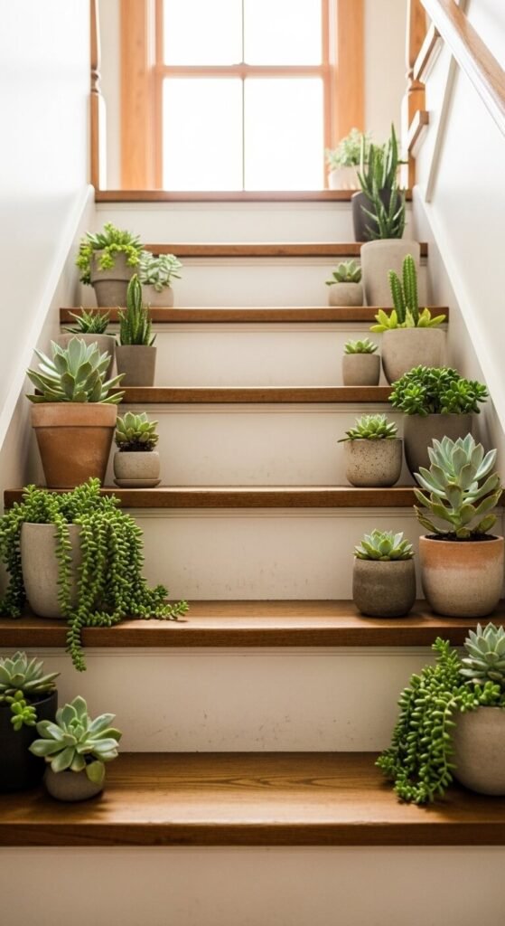 Staircases are wasted space in most homes. Place one pot on every other step going up the stairs for a dramatic, cascading effect. Use pots of varying heights to keep it interesting. Choose hardier succulents since staircases can be drafty and low-light. Anchor pots carefully so they don’t tip. This works especially well in entryway staircases where guests will notice it. It turns a plain staircase into a living design feature that costs almost nothing extra.