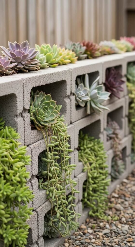 Cinder blocks are one of the most affordable outdoor planter materials available. Stack them to form a low wall, and fill the open cavities with cactus mix and succulents. Trailing varieties like string of pearls or donkey’s tail cascade out of the holes beautifully. This works along fences, patios, or the edges of raised garden beds. A single cinder block costs around $2. Stack six to eight for a full planter wall for under $25. Sturdy, weatherproof, and surprisingly stylish.