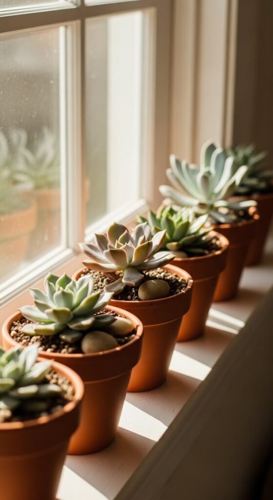 Group three to five small terracotta pots together on your windowsill. Odd numbers look more natural than even groupings. Mix different succulent shapes — one rosette, one tall and spiky, one trailing. Terracotta pots cost under $2 each at most garden centers. They also help with drainage, which keeps roots healthy. Rotate the pots every few days so all sides get equal light. This is one of the easiest and cheapest setups you can do today.