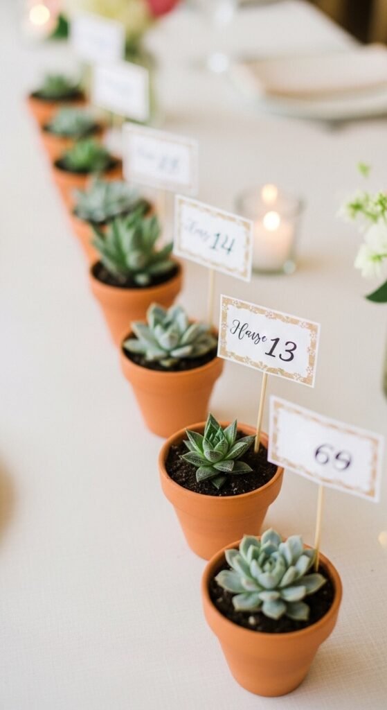 Succulents make stunning table number holders for weddings, dinner parties, or events. Push a small numbered flag or wire number into the soil of each pot. Guests can take the succulents home as party favors — which makes them even more special. Buy small succulents in bulk to keep costs low. Standard 2-inch pots with small echeverias typically cost $1–$2 each. Tie a small ribbon around the pot for an extra touch. These are memorable, practical, and zero waste.