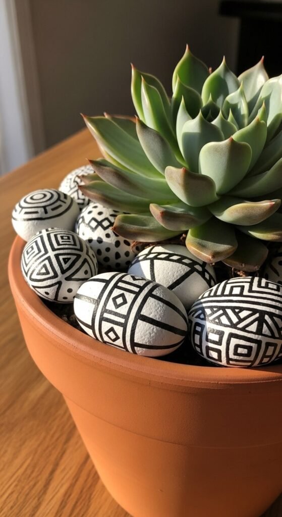 Painted rocks add color and personality to succulent pots. Use smooth river rocks and black paint to draw simple patterns — dots, stripes, or geometric lines. No art skills needed. Arrange them around the base of a large succulent in a pot. The rocks also help retain moisture in the soil. This is a cheap, fun weekend project. River rocks can be found for free outside or bought in bags for under $5. It makes even the most basic pot look purposefully styled.