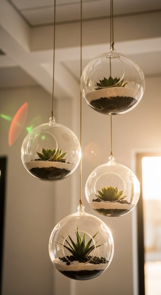 Glass globe planters hung from the ceiling bring a modern, airy feel to any room. Fill each globe with layered sand, pebbles, and cactus mix before adding a small succulent. Hang at different heights for a cascading, sculptural effect. Use gold or black hooks for a finished look. These globes are available online for $10–$15 each. Water by removing the plant and misting the roots monthly, then replacing it. Keep them near a bright window for best results.