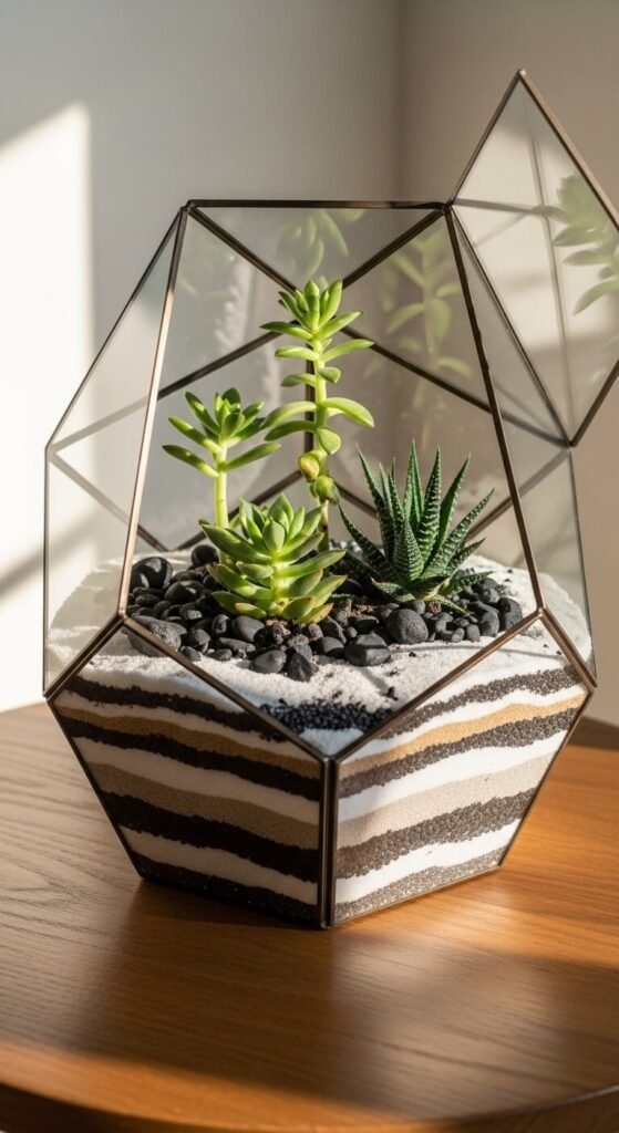 A glass terrarium adds a sculptural, gallery-like quality to any shelf. Layer the bottom with gravel, then activated charcoal, then cactus mix. Plant two or three small succulents at different heights. The layers are visible through the glass, which adds visual interest. Open terrariums work better than closed ones for succulents — they need airflow. You can find affordable geometric glass terrariums online for $15–$25. Add a small piece of quartz or a tiny figurine for personality.