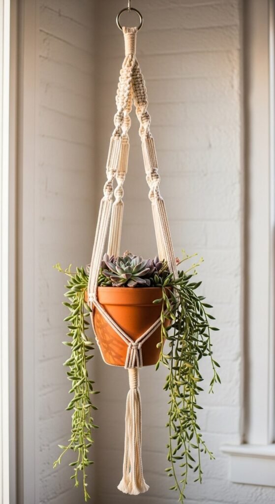 Macramé hangers bring texture and warmth to any wall or ceiling space. Trailing succulents like Sedum morganianum (burro’s tail) are perfect for this. They spill gracefully over the edges of the pot as they grow. You can buy a macramé hanger for $10–$20, or make one with basic cotton rope from a craft store. Hang it near a window for the best light exposure. This works especially well in bedrooms and living rooms where vertical space is underused.