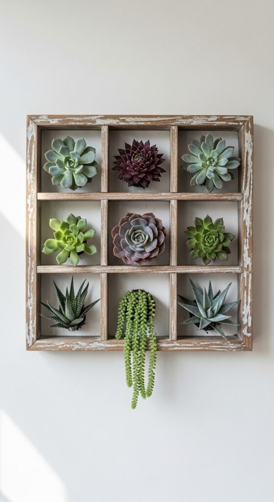 A shadowbox wall planter turns your succulents into living wall art. You can build one from reclaimed pallet wood for almost nothing. Divide the box into small compartments using thin wood strips. Fill each section with cactus soil and one small succulent. Mount it horizontally on a wall with sturdy picture hooks. Water lightly every two weeks. Over time, the plants fill out their compartments and the whole thing looks like a curated green mosaic.