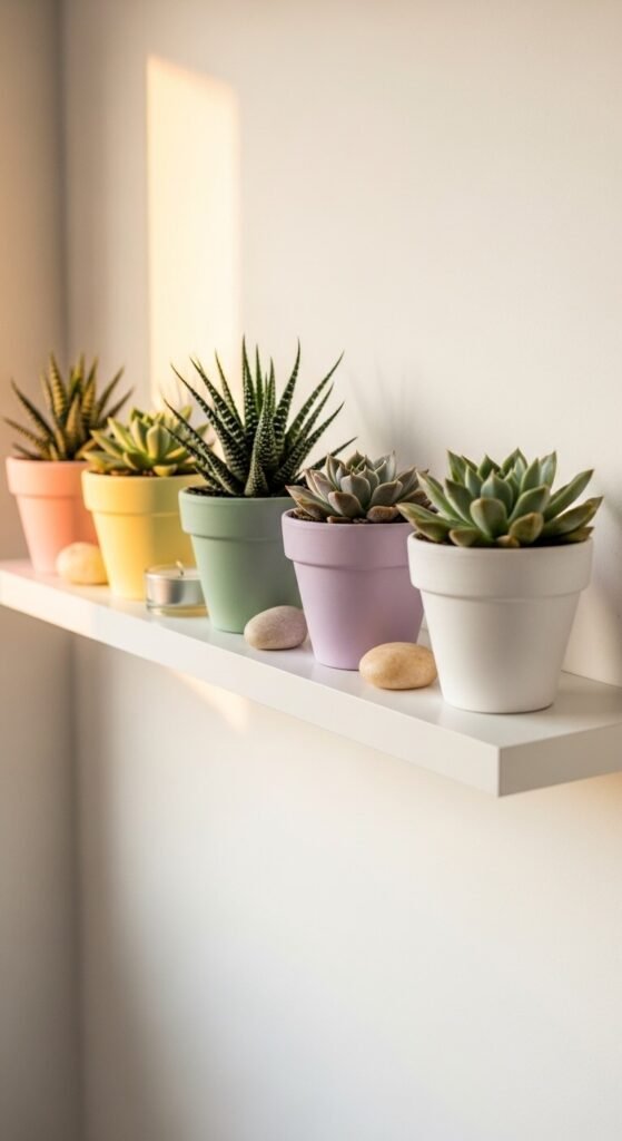 Painted pots are a simple way to add color without buying new furniture. Paint plain terracotta pots with chalk paint or outdoor acrylic. No sealing needed with chalk paint. Choose a palette that matches your room — pastels for soft vibes, bold colors for a pop of energy. Line them up on a floating shelf in height order or alternate sizes. This is a great rainy-day project that costs under $10 total. Kids can help paint too.