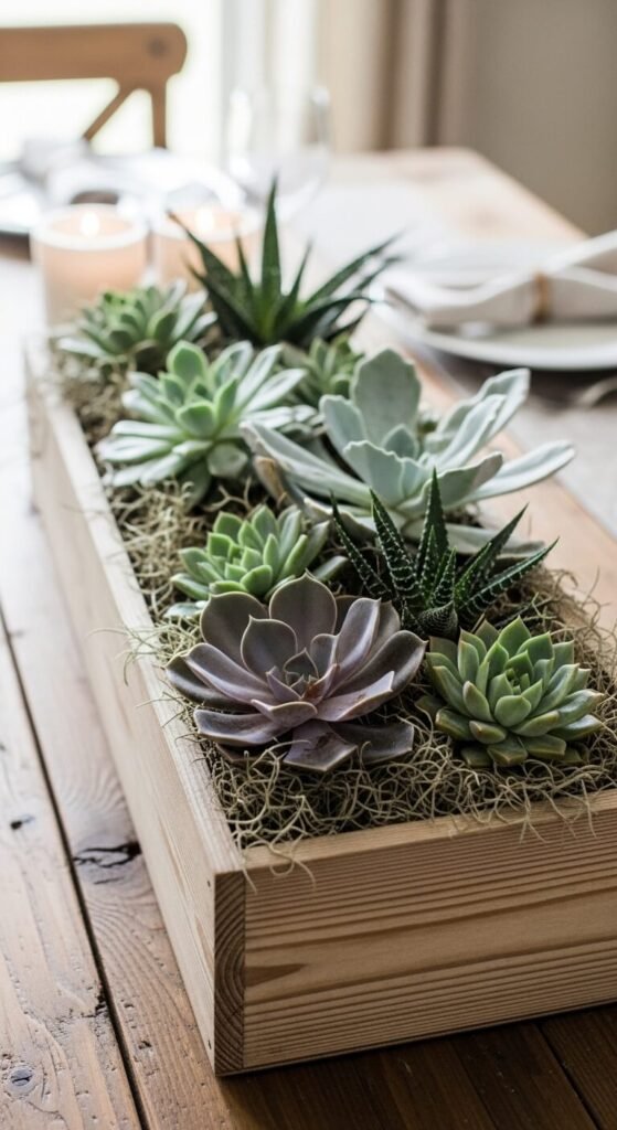A simple wooden crate or box makes a beautiful table centerpiece. Line the inside with a plastic bag or landscape fabric first to protect the wood. Fill with cactus mix, then pack in a variety of succulents tightly for a lush look. Tuck Spanish moss between plants to fill gaps. This works for dining tables, coffee tables, or outdoor patio settings. Water it lightly every 10–14 days. The whole setup can cost $20–$30 depending on the succulents you choose.