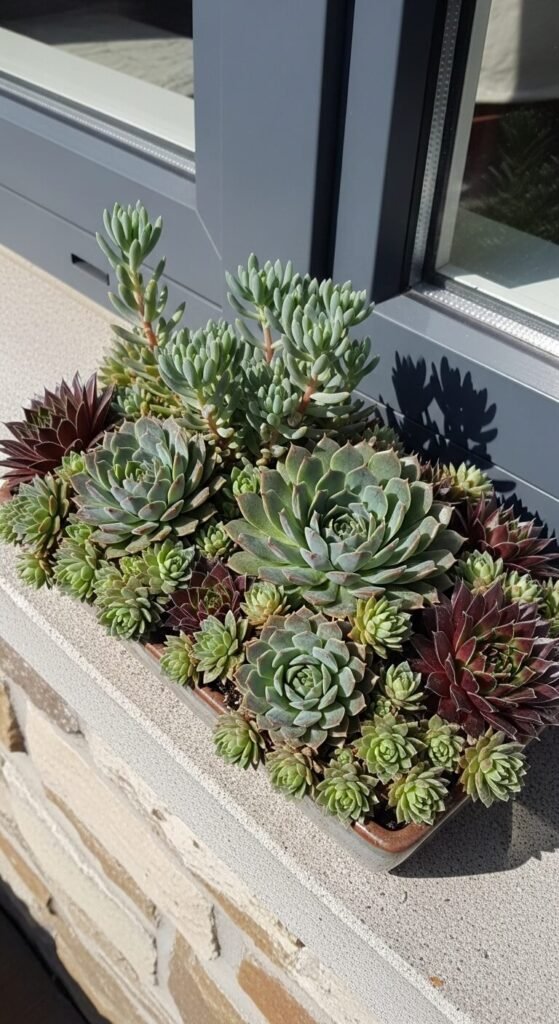 Try succulents for a modern, low-maintenance option. Buy a variety pack with 6-10 small succulents for $15-20. They need excellent drainage—mix regular potting soil with equal parts sand or perlite. Succulents survive on weekly watering and handle full sun. They won’t freeze in late spring frosts. Arrange them close together for a lush look that fills in over months. Many varieties change color in cooler weather.