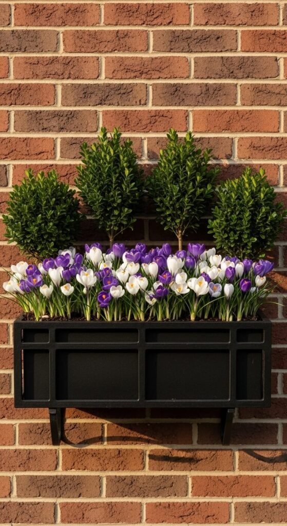Plant dwarf boxwoods ($8-12 each) at both ends for year-round structure. Fill the middle section with early spring bulbs like crocuses or grape hyacinths. The boxwoods stay green through all seasons while bulbs provide spring color. Trim boxwoods into balls or leave them natural. After bulbs fade, tuck in summer annuals. This formula creates a polished, upscale appearance. Boxwoods need minimal care and survive winter in the box.