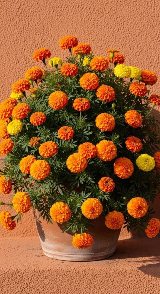 Marigolds offer maximum color for minimum money—6-packs cost $2-3. Plant them densely for a full look within two weeks. They repel some garden pests and smell distinctly spicy. Marigolds tolerate heat, drought, and poor soil. Deadhead weekly or let spent flowers drop naturally. They self-seed readily in warm climates. Mix French marigolds (short) with African marigolds (tall) for dimension. These workhorses bloom until hard frost.