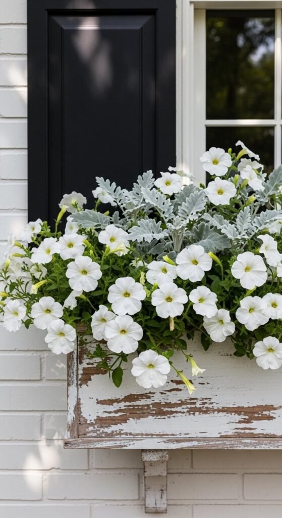 Create a sophisticated look with all-white flowers and silver foliage. Wave petunias spread quickly and cover a lot of space for $5-6 per plant. Dusty miller adds texture with its fuzzy, silvery leaves for $3-4. Plant two petunias and three dusty millers in a standard box. This combination glows in evening light and works with any architectural style. Both plants handle full sun and heat. Cut back petunias mid-season if they get straggly.