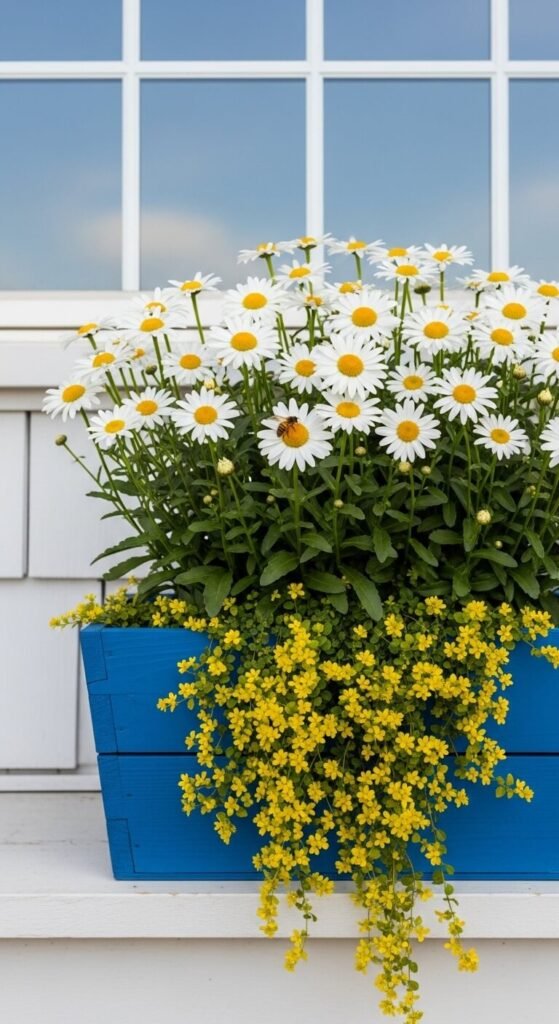 Plant Shasta daisies for that classic, cheerful flower look. Buy three plants for $4-5 each from a nursery. Add creeping Jenny ($3-4) at the front for a bright yellow waterfall effect. Daisies bloom repeatedly if you deadhead regularly. They prefer full sun but tolerate partial shade. Creeping Jenny grows aggressively—trim it back when it gets too long. This pairing stays green and attractive even between bloom cycles.