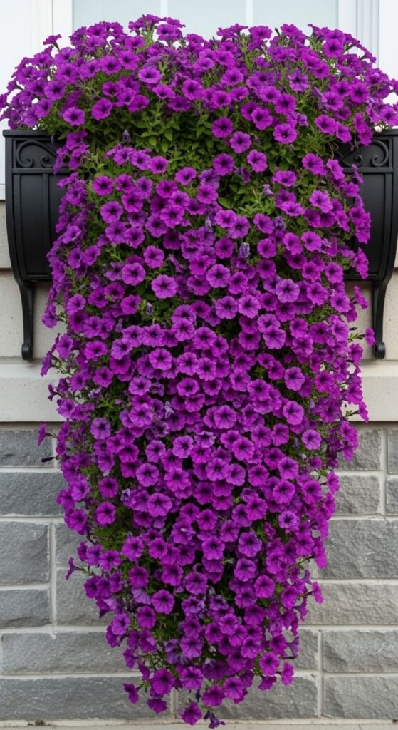 Choose wave or surfinia petunias specifically bred to trail dramatically. One or two plants ($5-7 each) will fill a 24-inch box completely. They grow fast and bloom constantly with almost no deadheading. Feed weekly with diluted liquid fertilizer mixed into water. Purple varieties show up beautifully from the street. Trim back by one-third in July if growth becomes excessive. These petunias can cascade three feet or more by late summer.