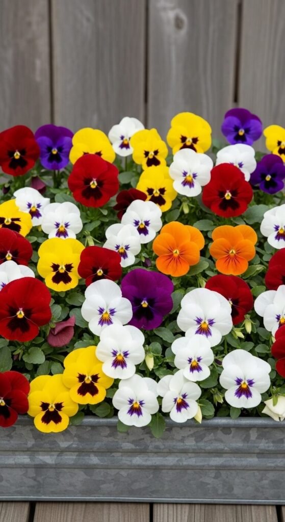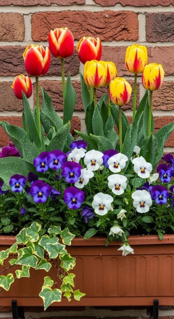 Plant tulip bulbs at the back and pansies up front for a layered look. The tulips add height while pansies spill over the edge. Buy pre-started pansies from a garden center for $2-3 per pack. Place them 4-6 inches apart. Tulips bloom first, then pansies take over as temperatures rise. This combo works in partial shade and handles cool spring mornings. Water when the top inch of soil feels dry. Add slow-release fertilizer once at planting time.