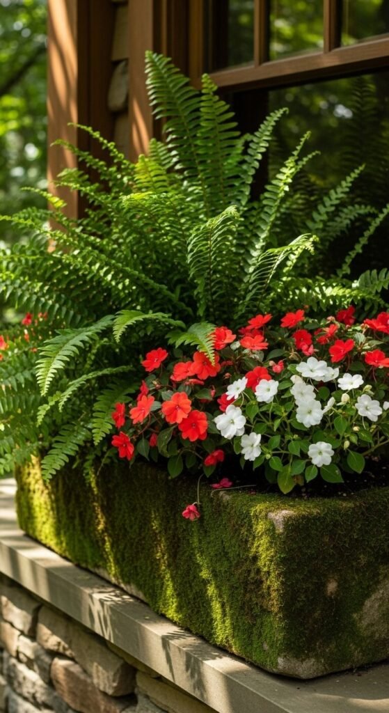 For north-facing or shaded windows, pair ferns with impatiens. Buy one Boston fern ($8-10) for the center and surround it with 4-6 impatiens ($2-3 each). Both plants love shade and moisture. This combination creates a lush, tropical vibe. Keep soil consistently moist but not soggy. Impatiens bloom all season without deadheading. The fern adds elegant texture and grows fuller each month. Bring the fern indoors before the first freeze.