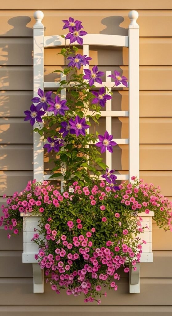 Insert a small trellis behind your window box and plant a clematis vine ($12-15). Fill the box with trailing calibrachoa ($4-5 each) in complementary colors. The clematis adds height and drama while calibrachoa spills over the edge. Both bloom profusely in spring and summer. Clematis roots stay cool in the box while vines grow upward. Calibrachoa handles heat better than petunias and needs no deadheading. Water daily during hot spells.