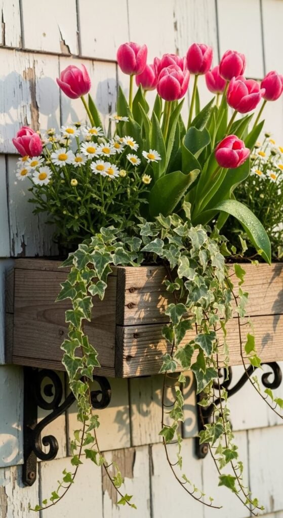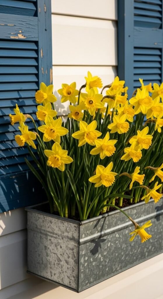 Fill your box with nothing but daffodils for maximum impact. Buy 20-30 bulbs in fall for $10-15, or grab potted ones in spring for instant results. Plant bulbs close together—they don’t mind crowding. Daffodils handle cold snaps and deer won’t eat them. They bloom for 2-3 weeks and require almost no care. Mix different varieties for varied heights and bloom times. Save the bulbs after flowering for next year.