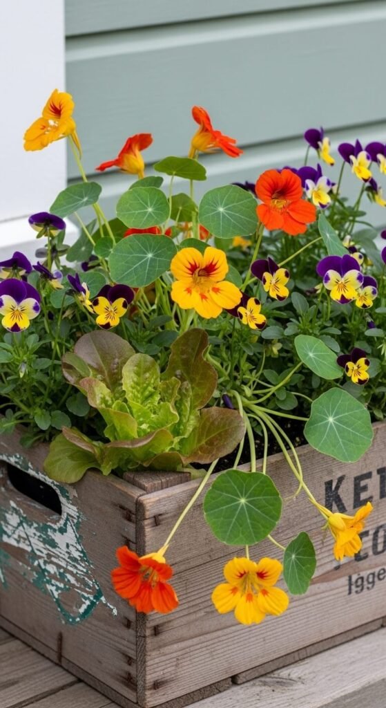 Plant flowers you can eat for beauty and function. Nasturtiums ($2-3 per pack of seeds), Johnny jump-ups ($3-4), and violas all taste peppery or sweet. Add them to salads or freeze in ice cubes. Sow nasturtium seeds directly in the box—they germinate in 7-10 days. These flowers attract pollinators and beneficial insects. They prefer moderate temperatures and may slow down in summer heat. Harvest regularly to encourage more blooms and tender leaves.