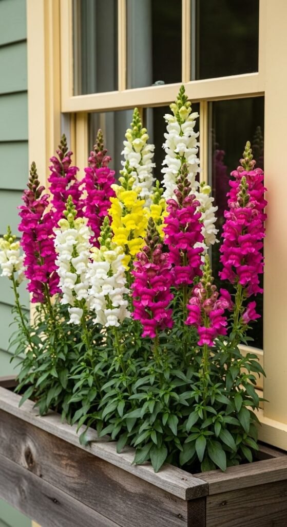 Plant all snapdragons for a vertical spectacle. Buy tall varieties ($3-4 per plant) in mixed colors. They grow 18-24 inches tall and fill space upward instead of outward. Snapdragons bloom longer in cool weather. Deadhead by cutting stem above lower leaves—you’ll get a second flush of flowers. They may self-seed for surprise volunteers next year. Kids love the “snapping” motion when you squeeze the flower. This old-fashioned favorite never disappoints.